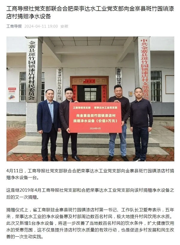 - 榮事達水工業(yè)公司黨支部攜手工商導報社黨支部捐贈凈水設備,助力金寨縣漆店村美麗鄉(xiāng)村建設!