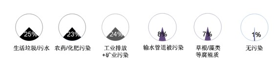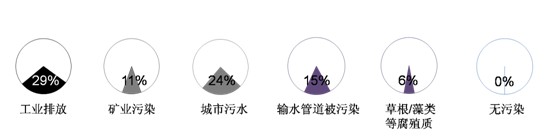 圖2. 家庭飲用水的主要來源工礦產業、農藥化肥、生活污水成百姓飲水安全三大“攔路虎”本次調查分別向被訪者所感受到的城市鄉村的水污染情況進行了解,其中重點調查了百姓認識到的本地水污染的源頭。——污染源:城市水污染主要與產業結構有關,工業排放(29%)和“礦業污染”(11%)對水資源的污染占到四成。值得關注的是,“城市污水”污染被24%被訪者認為其是主要污染源。蘭州水污染事件讓人們注意到了“輸水管道被污染”對水安全造成的影響,15%被訪者認為自己所住城市的水污染受此影響。有專家分析水污染,認為“草根、藻類等腐殖質”是主要原因之一,被訪者中6%接受這一看法。