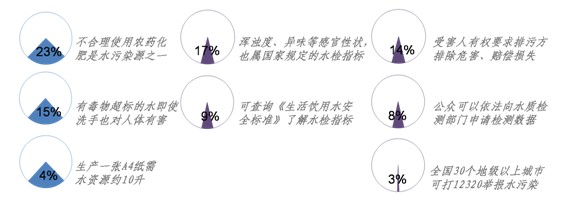 圖6. 對所住地區“飲用水水源保護區”保護情況的了解本次調查同時詢問了被訪者對一些水安全知識的認知相對而言,人們對一些科普、知識性的信息認知度較高,“過量、不合理使用化肥、農藥是水污染源之一”已經較為廣泛地被人們所了解(23%);不少人也清楚“汞、砷等有毒物超標的水即使只是洗手也會對人體有害”(15%),即使是“生產一張A4紙所需要的水資源約10升”這樣的“冷知識”,也有一定被訪者有所了解(4%)。——對于自己在水安全方面,有哪些權利、如何維護等問題,人們有所了解,但人數比例較低。例如17%知道“渾濁度、異味等感官性狀,也屬于國家規定的水質檢測指標”,而只有9%的人知道“想了解水質檢測有哪些指標,可查詢《生活飲用水安全標準》”;在維權方面,14%被訪者知道“受害人有權要求排污方排除危害、賠償損失”,8%知道“公眾可以依法向水質檢測部門申請檢測數據”,“目前全國有30個地級以上城市可撥打12320舉報水污染事件”,但只有3%的被訪者了解這一點,6%的被訪者對上述我們所提出的水安全知識表示“一概不知”。