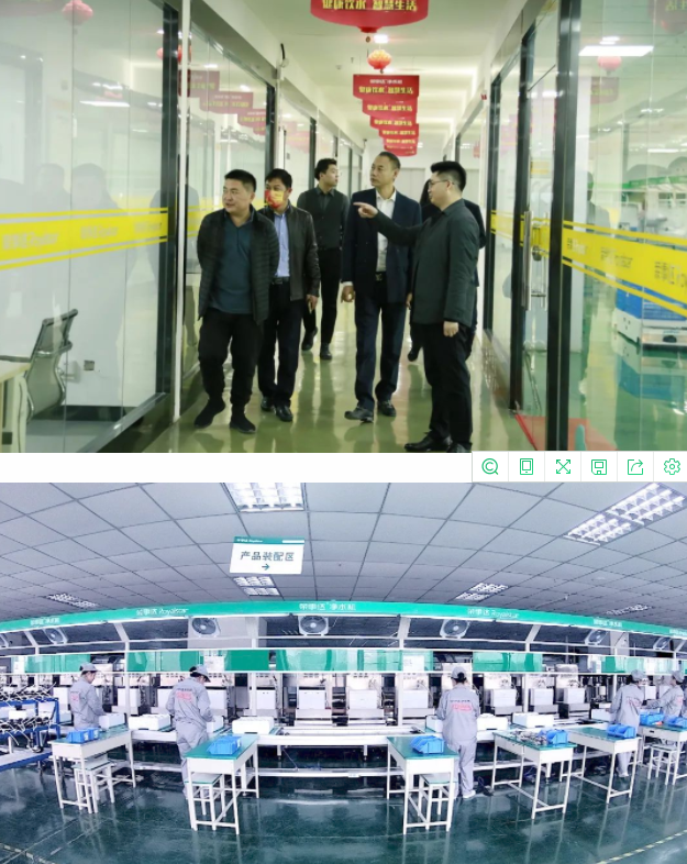 領導一行先后參觀了榮事達商用設備生產車間、榮事達智能家用凈水生產車間和智慧水世界展廳。了解榮事達企業綜合實力及十大水處理系統具體發展狀況。