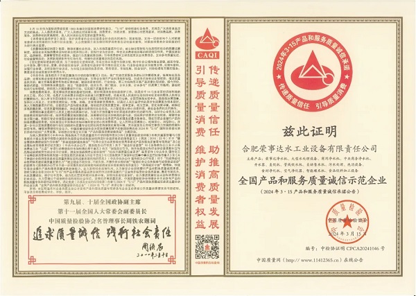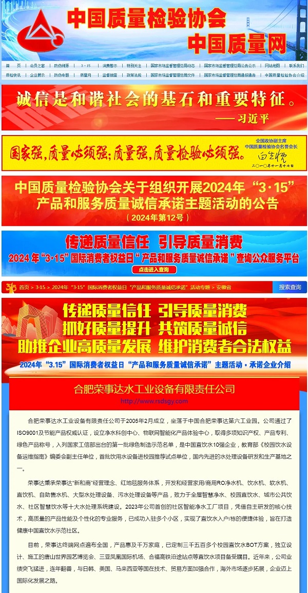 傳遞質(zhì)量信任,引導(dǎo)質(zhì)量消費(fèi)。 在由中國(guó)質(zhì)量檢驗(yàn)協(xié)會(huì)主辦的2024年“3·15”產(chǎn)品和服務(wù)質(zhì)量誠(chéng)信承諾的主題活動(dòng)中,榮事達(dá)水工業(yè)公司憑借卓越的產(chǎn)品品質(zhì)及良好的社會(huì)形象,獲得協(xié)會(huì)以及權(quán)威專家的一致認(rèn)可,榮膺 “全國(guó)產(chǎn)品和服務(wù)質(zhì)量誠(chéng)信示范企業(yè) ”“全國(guó)凈水行業(yè)質(zhì)量領(lǐng)先企業(yè)”“全國(guó)凈水行業(yè)質(zhì)量領(lǐng)先品牌”“全國(guó)產(chǎn)品和服務(wù)質(zhì)量誠(chéng)信品牌”“全國(guó)質(zhì)量檢驗(yàn)穩(wěn)定合格產(chǎn)品”“全國(guó)質(zhì)量檢驗(yàn)信譽(yù)保障產(chǎn)品”“全國(guó)消費(fèi)者質(zhì)量信譽(yù)保障產(chǎn)品 ”多項(xiàng)榮譽(yù)。