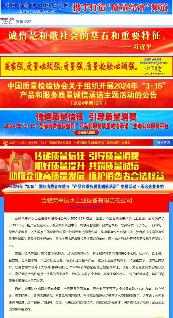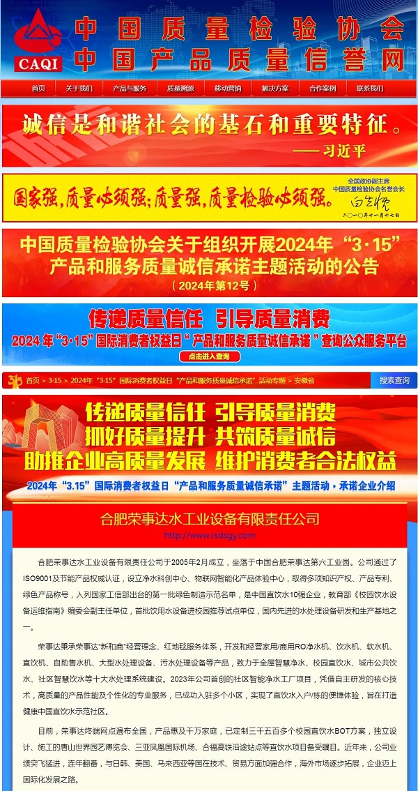 - 熱烈祝賀榮事達(dá)在2024年全國(guó)“3·15”活動(dòng)中斬獲“全國(guó)凈水行業(yè)質(zhì)量領(lǐng)先品牌”、“全國(guó)產(chǎn)品和服務(wù)質(zhì)量誠(chéng)信示范企業(yè)”等七項(xiàng)殊榮
