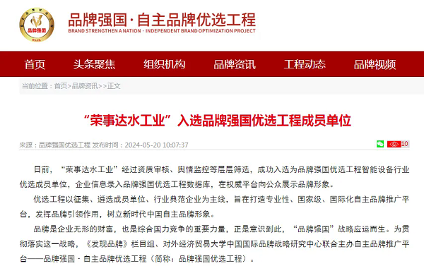 “榮事達(dá)水工業(yè)”入選品牌強(qiáng)國(guó)優(yōu)選工程成員單位