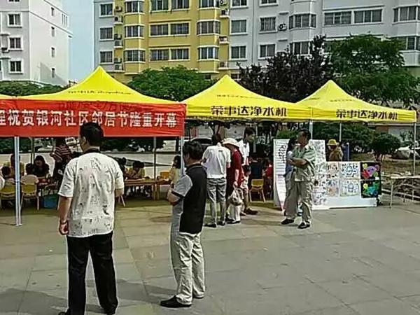 據悉,為了居民們在炎熱的夏日感受到一絲清涼,榮事達凈水機山東日照代理商和公司工作人員為居民們現場搭建帳篷,并且將凈水機搬到了活動現場,方便大家在參加活動的時候喝到免費安全的健康水?,F制現飲的純凈水受到了居民們的一致好評。