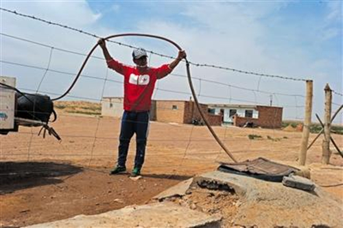 知情人告訴記者,在額里斯鎮沙漠腹地,有大約40多口挖掘深度大約在180米的取水井,均是供應工業園區生產用水。記者在一處編號為31號的供水井看到,水井的蓋子上寫著“慶華精細化工工業園供水”,知情人指著遠處一排排伸向沙漠腹地的電線桿說,每個線路的盡頭,都是這樣的水井,逐年增多,井也越挖越深。